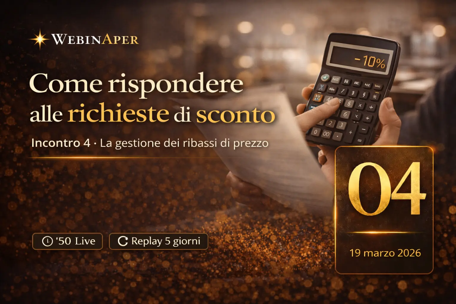 Questo corso ti fornisce framework, domande e alternative allo sconto per mantenere il controllo della trattativa e diventare un vero partner per il cliente, non un fornitore intercambiabile.